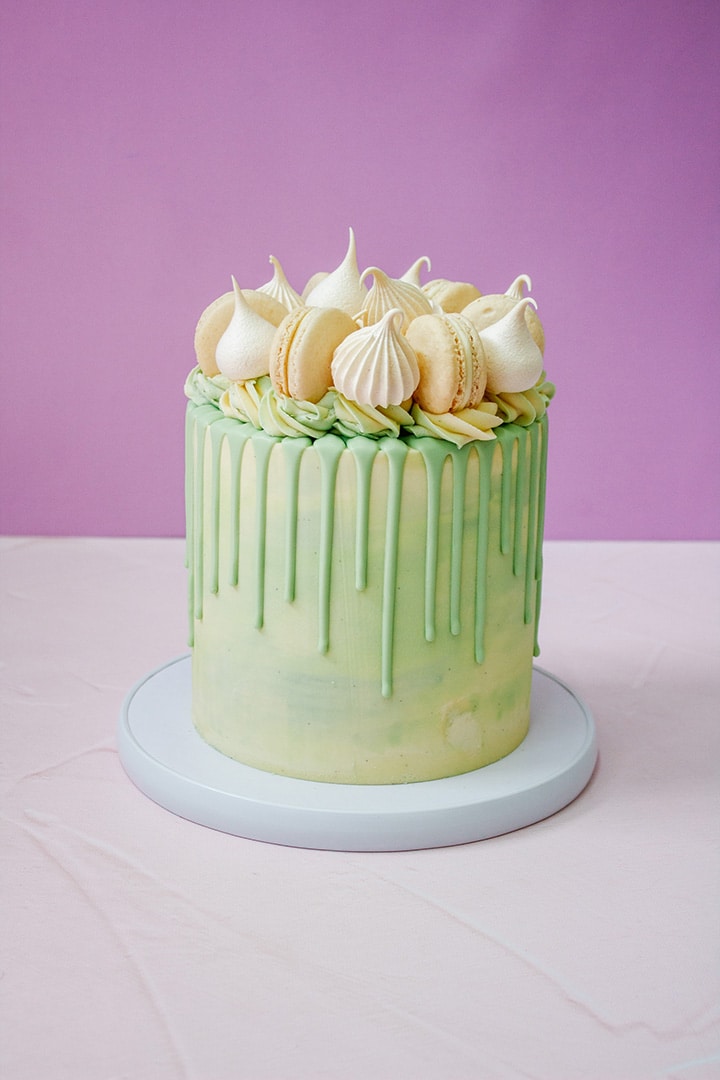 A fun & funky cake topped with macarons, meringues and white chocolate drips.