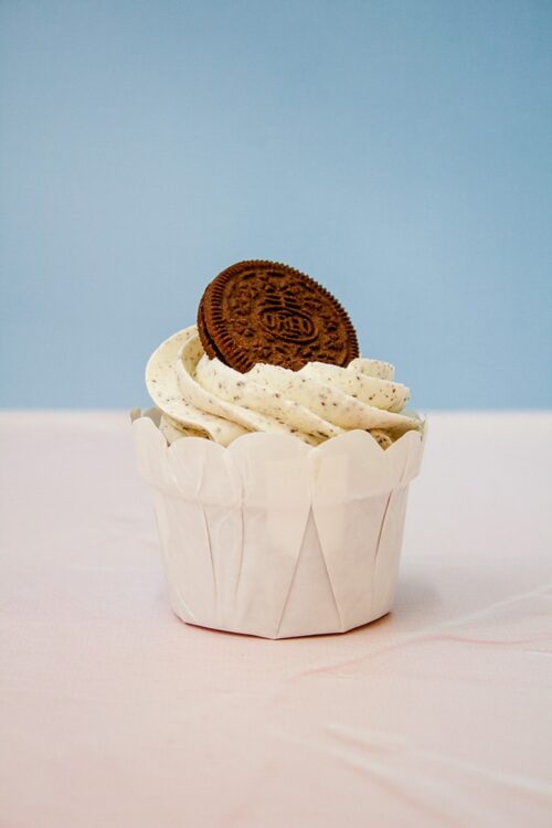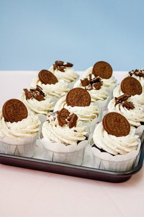 Chocolate cupcakes topped with swirls of Oreo crumb vanilla bean buttercream. Half of the cupcakes are topped with a whole Oreo each, and the other half is topped with crushed Oreos.