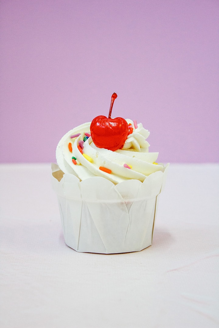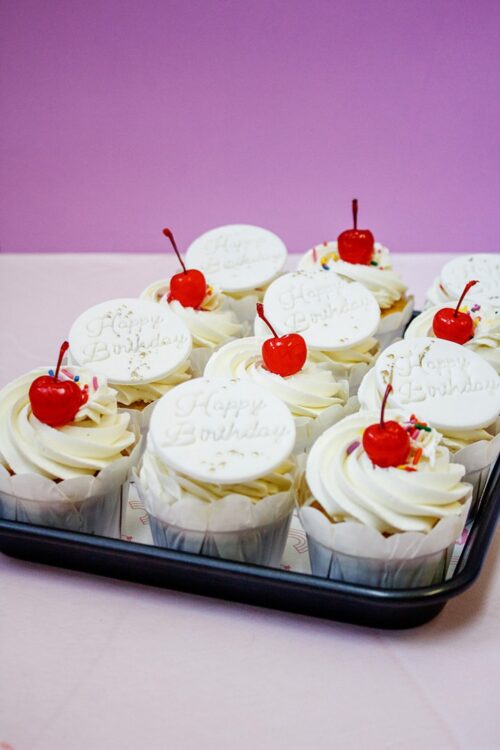 The ultimate birthday treat! Vanilla funfetti cupcakes topped with swirls of vanilla bean frosting and topped with birthday sprinkles. Half are topped with maraschino cherries, and the other half is topped with an edible fondant disk with “Happy Birthday” impressed into them.