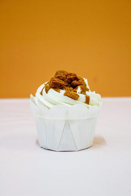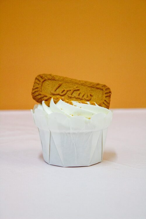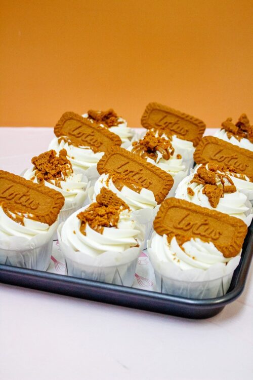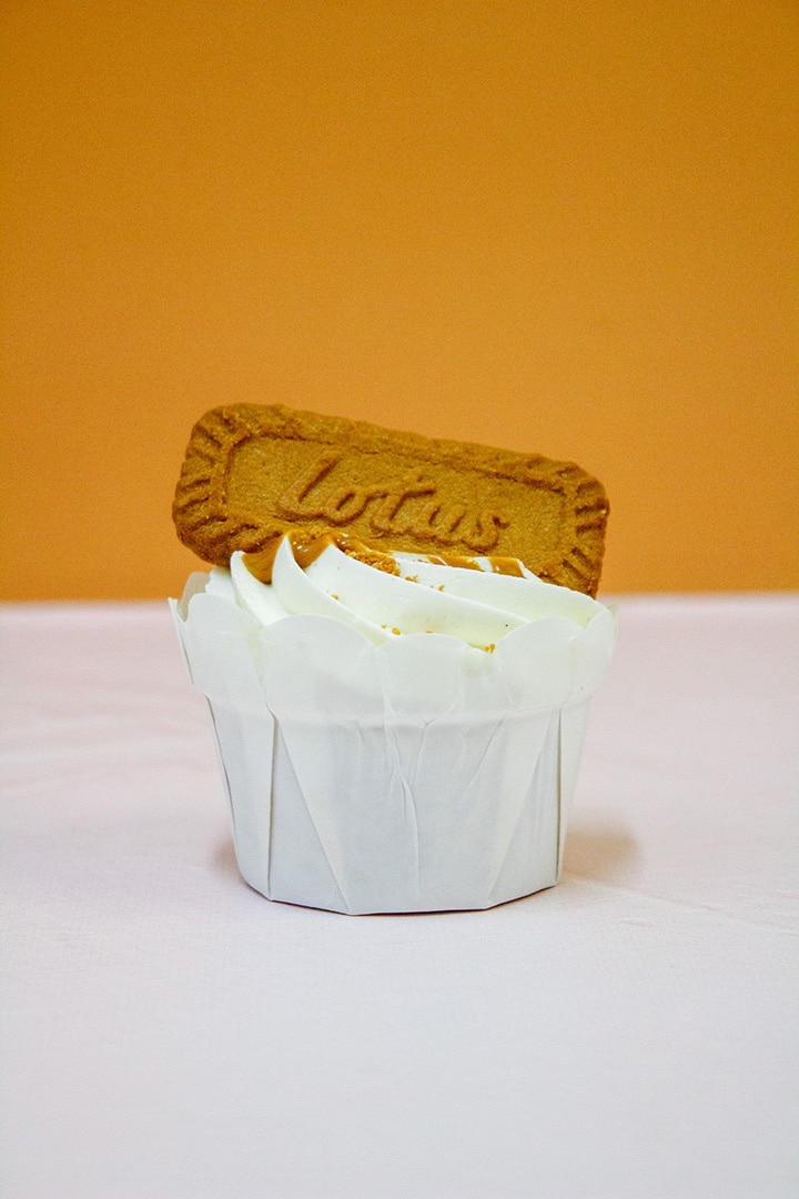 Vanilla bean cupcakes are filled with a hidden surprise of Biscoff spread. Each cupcake is topped with swirls of creamy vanilla bean buttercream and drizzled with luscious Biscoff spread. Half are topped with a whole Biscoff biscuit, while the other half is sprinkled with crunchy Biscoff crumb.