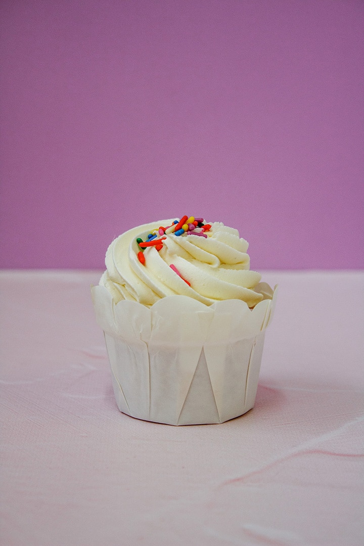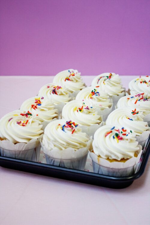 Our delicious vanilla bean cupcakes loaded with rainbow sprinkles, topped with swirls of vanilla bean buttercream and even more sprinkles. Perfect for any occasion!